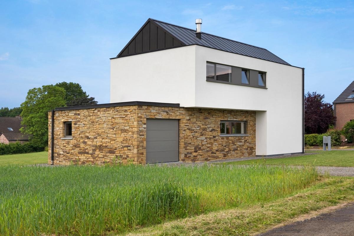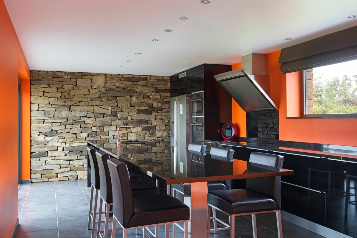 Cette maison à ossature bois est atypique à tout point de vue. Le maître d’ouvrage a tout d’abord choisi d’associer une façade en pierre naturelle locale à une partie sobre en crépi. La pierre de façade se retrouve aussi à l’intérieur, gage d’un cachet chaleureux dans le hall d’entrée et la cuisine. Pour l’agencement des pierres, l’architecte a fait appel à un professionnel local. Les châssis en aluminium et la peinture rouge orangé ponctuent eux aussi l’ensemble d’une touche de modernité. Vu la forme du terrain, la cuisine est perpendiculaire au reste de la maison, ce qui engendre un décalage intéressant en termes d’implantation. À l’intérieur, le blanc et les encadrements de porte en bois règnent en maîtres. Enfin, la toiture est en zinc.